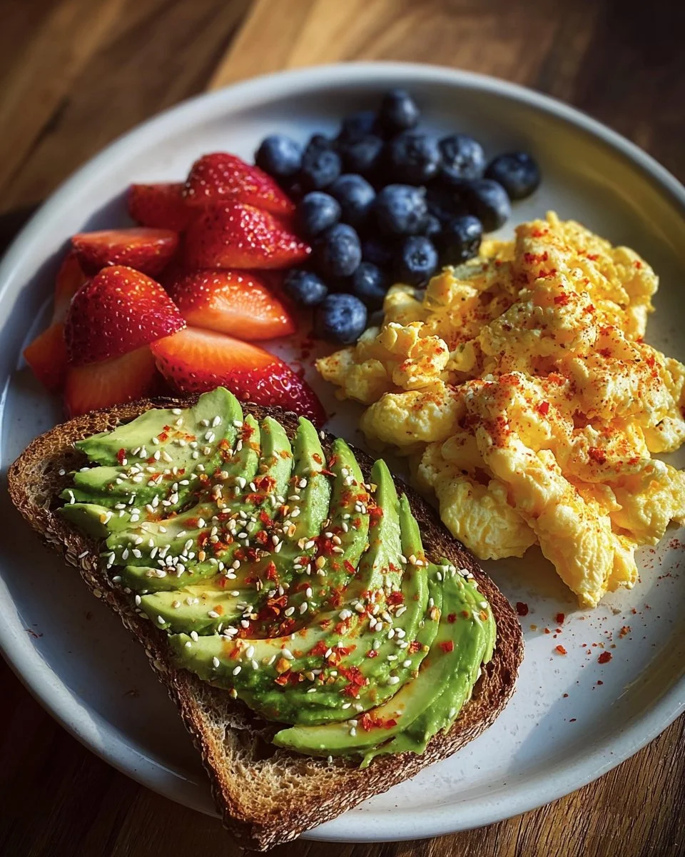A delightful and wholesome breakfast option featuring creamy avocado, fluffy scrambled eggs, and fresh berries, perfect for a nutritious morning meal.