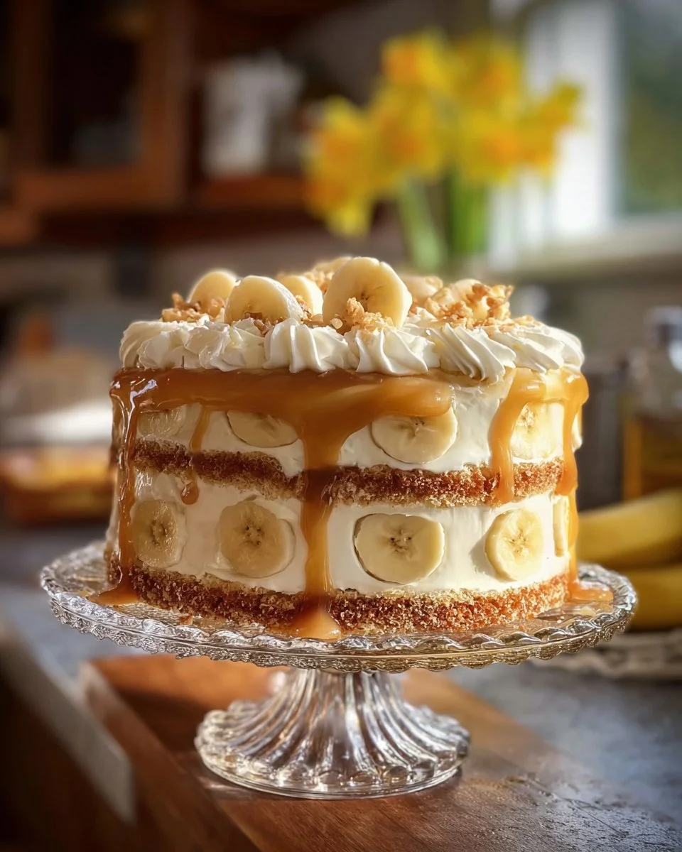 A delicious no-bake cake featuring layers of creamy filling, fresh bananas, and a drizzle of caramel.