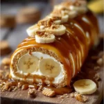 - Drizzle the caramel sauce over the roulade, sprinkle with crushed graham crackers and banana slices, and dust with powdered sugar for a beautiful finish.