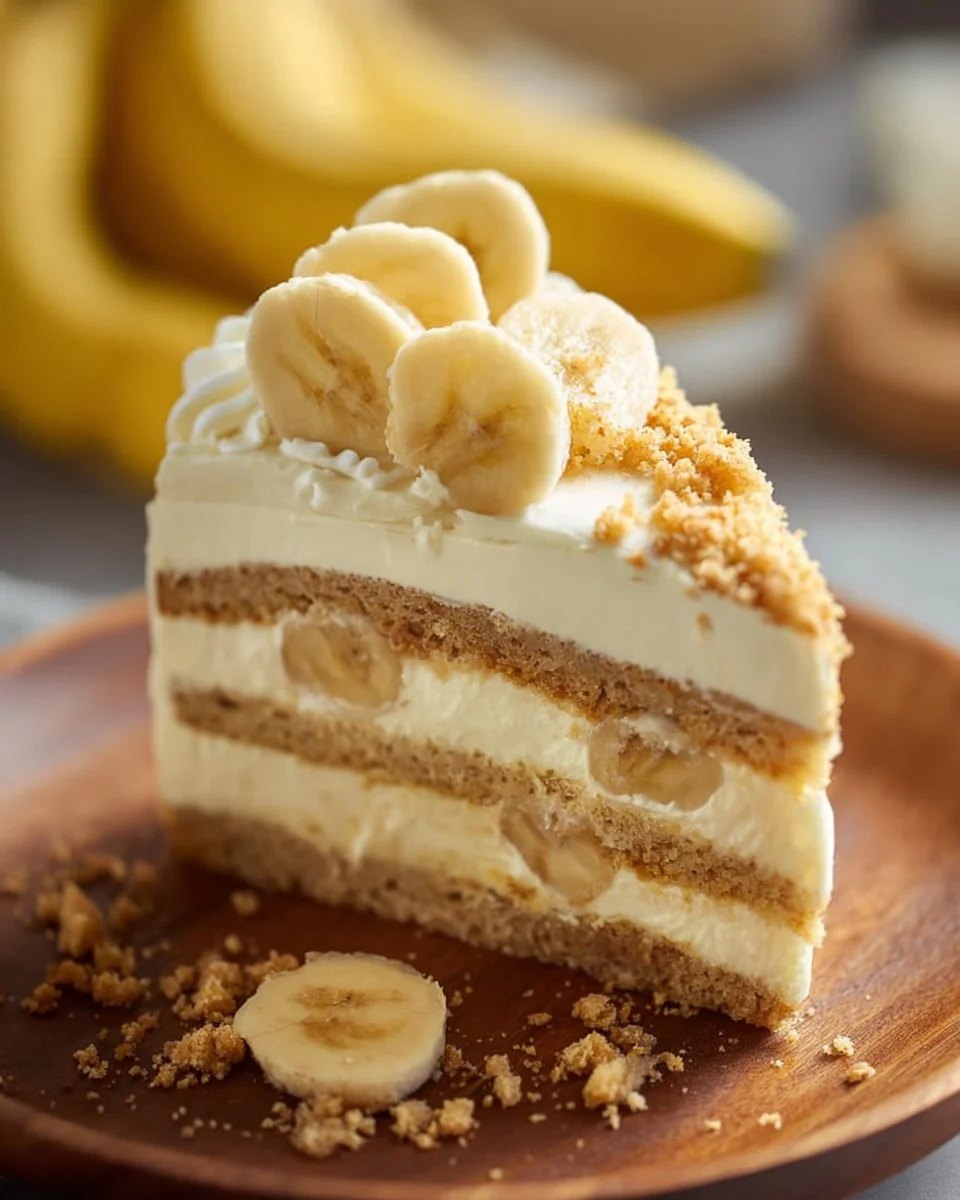 A creamy dessert that combines the flavors of banana cream pie with cheesecake, featuring a buttery graham cracker crust and topped with whipped cream.