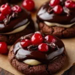 Delicious flourless brownie cookies filled with juicy cherries and topped with fluffy whipped cream, combining the flavors of classic Black Forest cake.