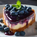 Make the Blueberry Cheesecake: Preheat your oven again to 350°F (175°C). Grease an 8-inch springform pan and line the bottom with parchment paper. Wrap the pan tightly in aluminum foil. In a large bowl, beat the softened cream cheese with vanilla, sugar, and cornstarch until smooth and creamy. Add the eggs and mix well, making sure to scrape down the sides of the bowl. Fold in the fresh blueberries, then pour the cheesecake batter into the prepared springform pan. Smooth the top and bake for 50–60 minutes, or until the center is set. Turn off the oven and leave the cheesecake inside with the door slightly ajar for 30 minutes. Remove and allow to cool to room temperature, then refrigerate for at least 4 hours or overnight.