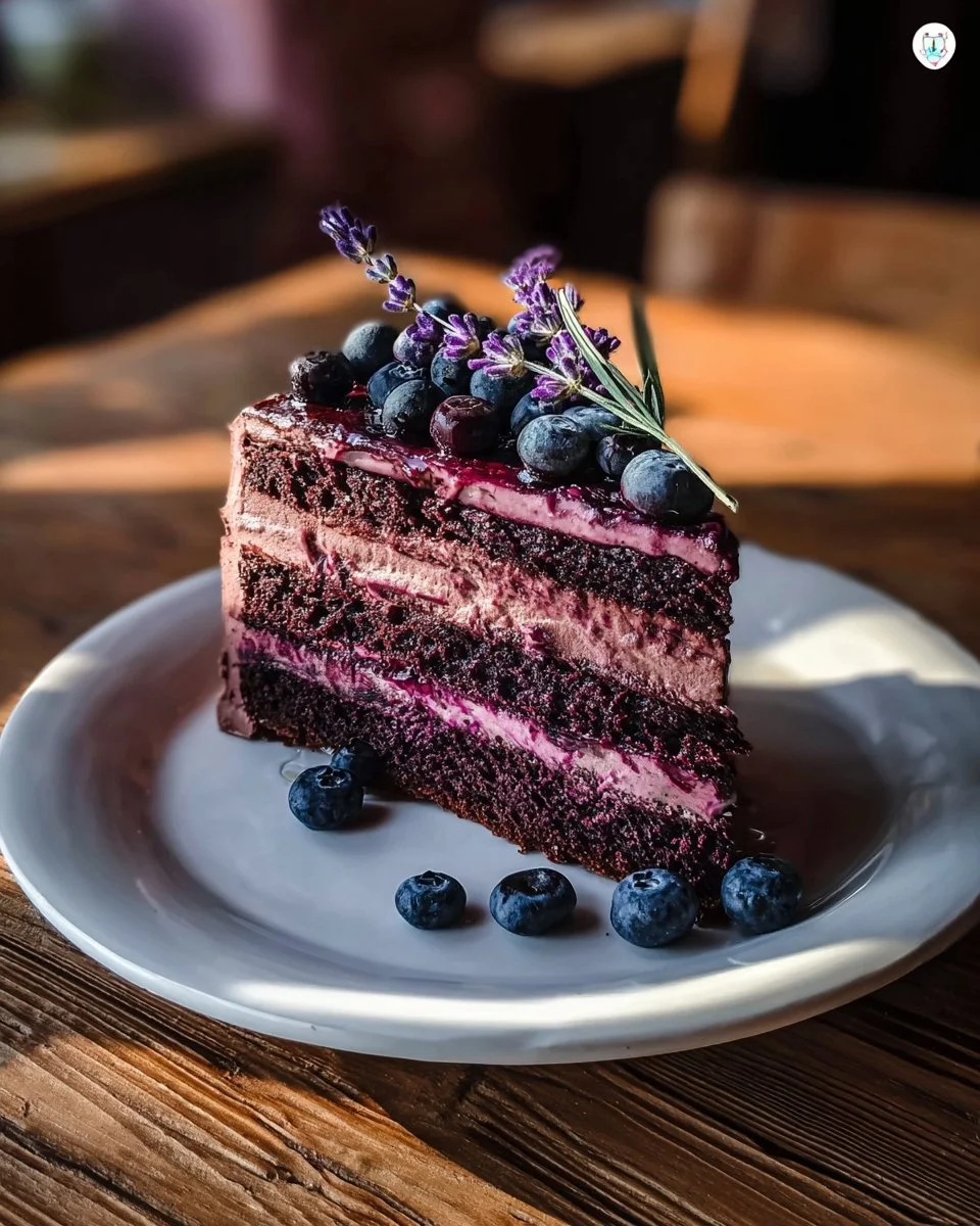 A delightful dessert combining sweet blueberries, rich chocolate, and floral lavender for a unique cake experience.