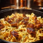A flavorful and satisfying one-pan dish featuring seasoned chicken, creamy cheese sauce, and bowtie pasta.