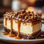 A decadent dessert that combines creamy cheesecake with a crunchy toffee layer and rich caramel, perfect for any occasion.