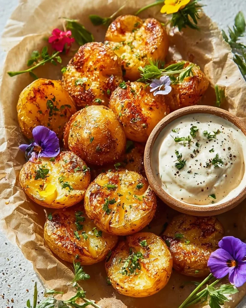 Crispy Cheese Smashed Potatoes with Herbed Yogurt Dip