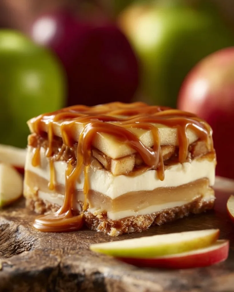 Delicious Caramel Apple Delight dessert with caramel drizzled over apple slices