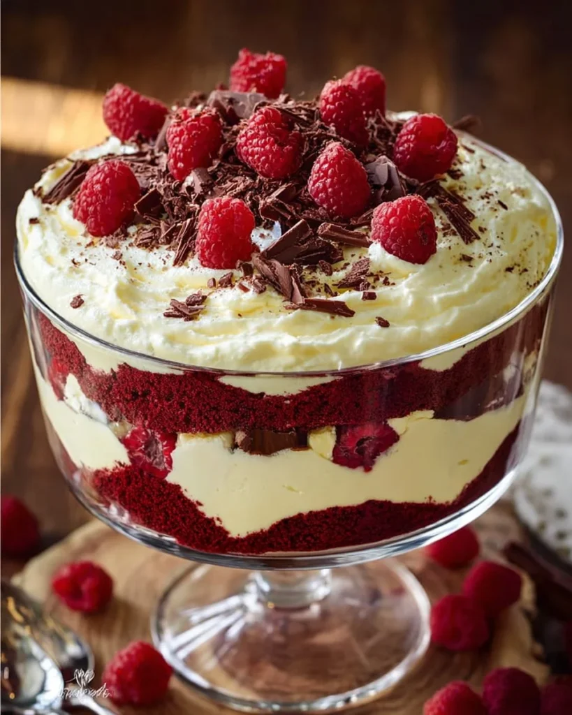 Delicious Red Velvet White Chocolate Trifle layered with cream and cake