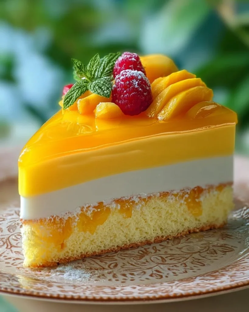 Delicious Mango Mousse Cake topped with fresh mango slices and whipped cream