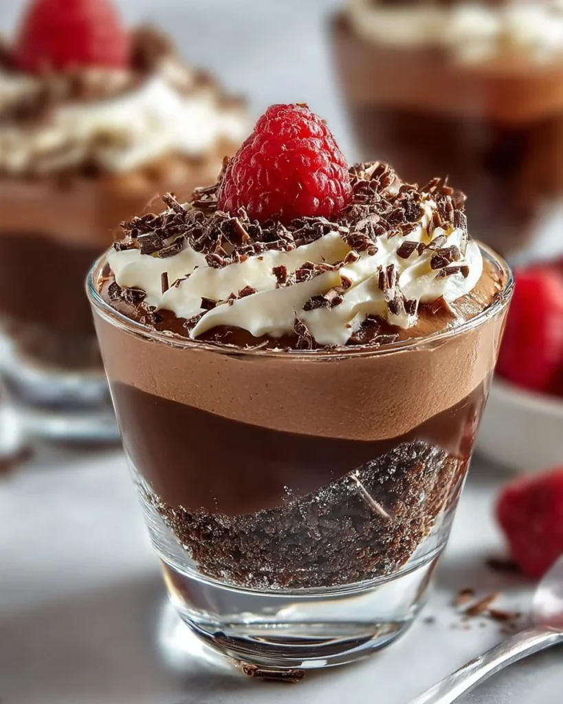 Delicious whipped chocolate cheesecake parfaits in glass cups.