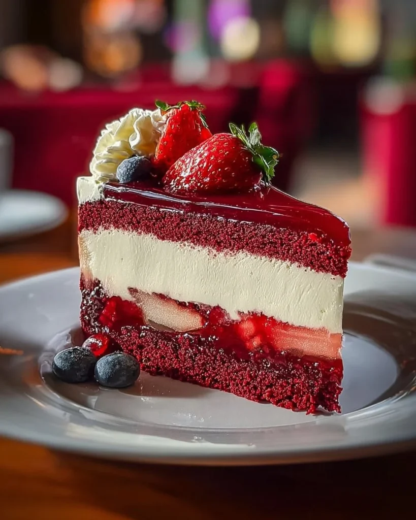 Red Velvet Strawberry Cheesecake slice on a plate with fresh strawberries