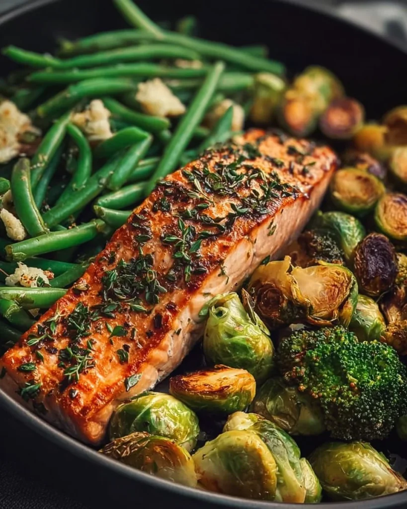 Mediterranean Roasted Salmon & Veggie Power Bowl with Garlic Green Beans