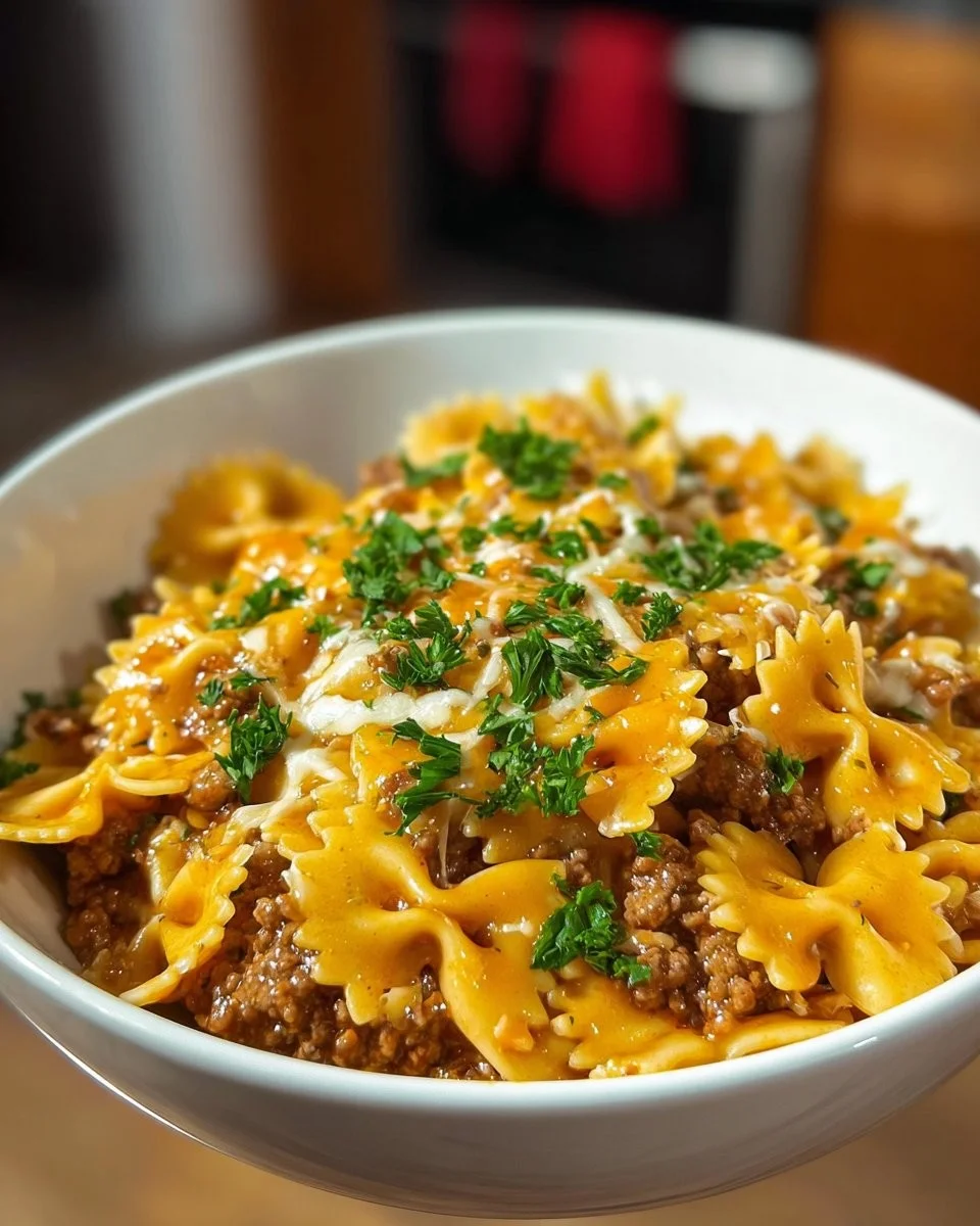 A delicious and comforting dish featuring bowtie pasta, ground beef, and creamy cheese in a delightful garlic butter sauce.