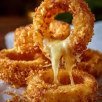Deliciously crispy onion rings filled with gooey mozzarella cheese, perfect as an appetizer or snack.