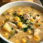 A warm and comforting chowder featuring tender chicken, sweet corn, and a creamy broth, perfect for cozy meals.