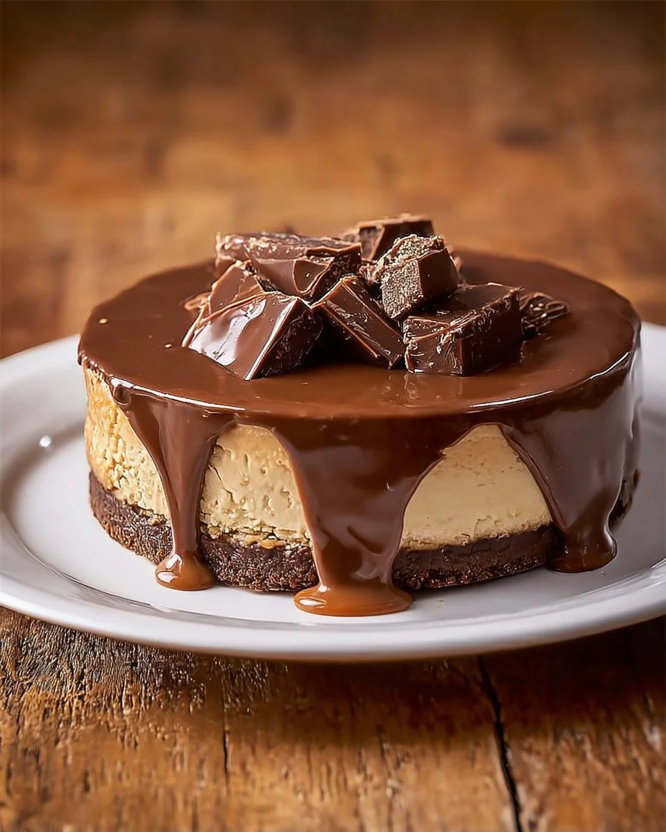 A mouthwatering cheesecake that combines creamy richness with the flavors of chocolate and caramel, topped with Twix bars.