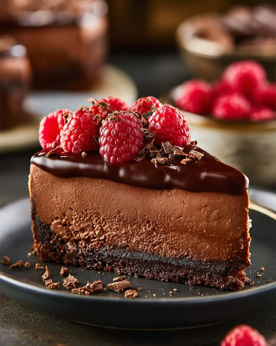 Serve chocolate cheesecake chilled and cut into slices. You can add fresh raspberries or chocolate shavings on top for a beautiful presentation. It pairs well with a cup of coffee or a glass of milk.