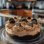 A rich chocolate cheesecake with a crunchy Oreo crust, perfect for chocolate lovers.