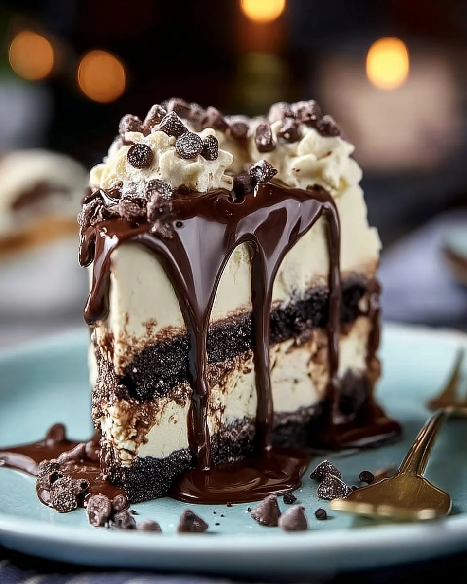 A delicious treat combining chocolate chip cookies and ice cream in a rich layered cake.