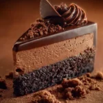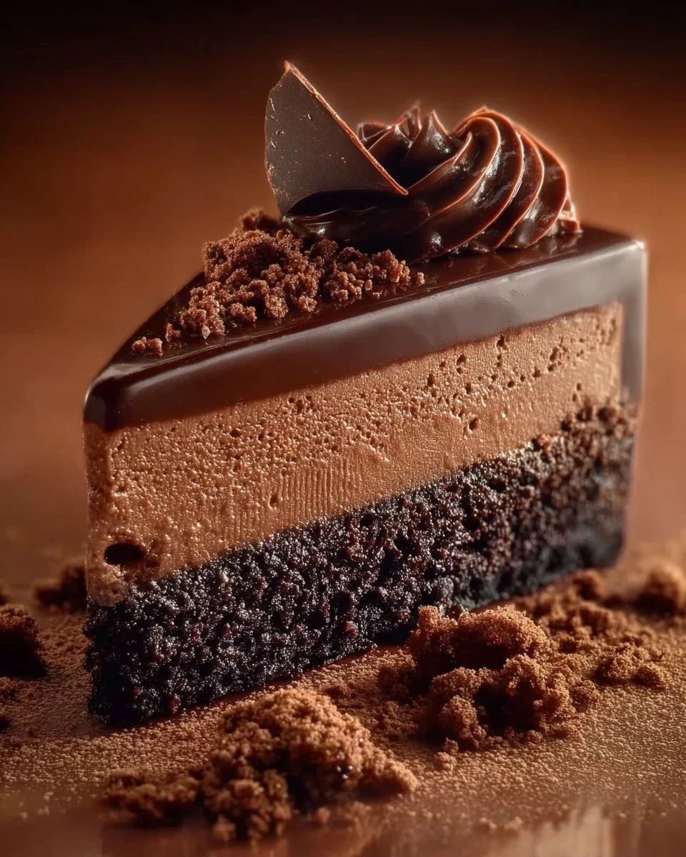 A decadent dessert combining rich chocolate flavors with a smooth cream cheese filling over a crunchy graham cracker crust, topped with luscious chocolate ganache.