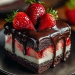 8. Before serving, garnish with fresh strawberries and drizzle melted chocolate over the top.