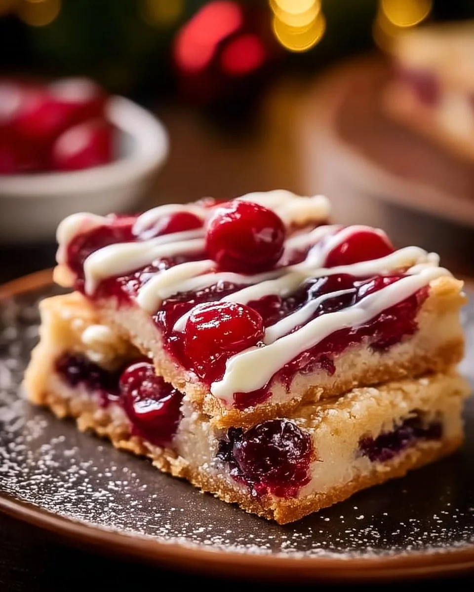 Delightful cherry bars with a rich buttery base, perfect for the holiday season.