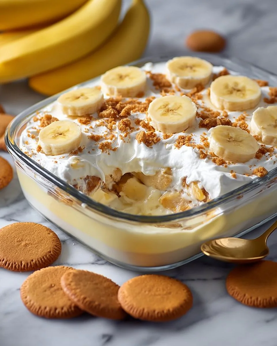 A delightful no-bake dessert with layers of sweet vanilla pudding, bananas, and crunchy vanilla wafers.