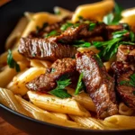 A delightful dish that combines tender steak with rich, creamy sauce and pasta, perfect for a comforting dinner.