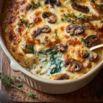 A comforting and hearty dish combining tender chicken, earthy mushrooms, and fresh spinach in a rich, creamy sauce, all baked together for a delightful meal.