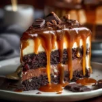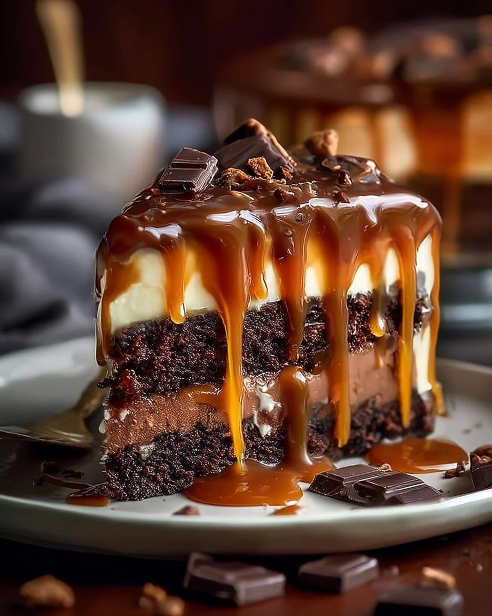 A rich dessert combining chocolate, creamy cheesecake, and sweet caramel, perfect for special occasions.