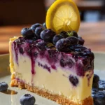 A creamy and fruity cheesecake combining layers of blueberry mousse, cream cheese, and zesty lemon topping, perfect for special occasions.