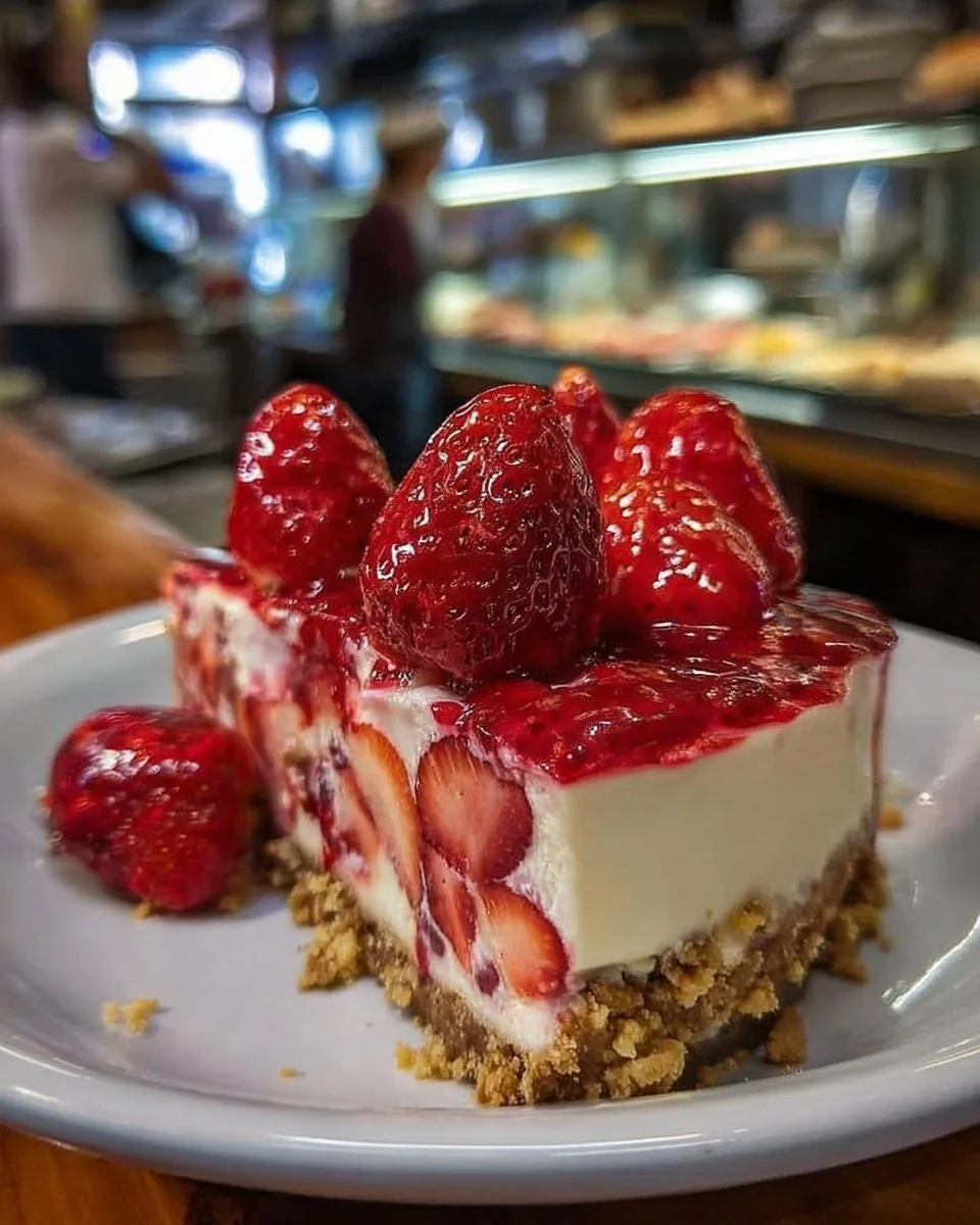 Slice the cheesecake into wedges and serve it chilled. You can add extra fresh strawberries on top or drizzle some strawberry sauce for a fruity touch. This dessert is perfect for sharing, so be ready to make more than one slice!