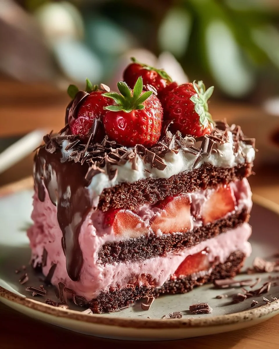 A delicious treat combining moist chocolate cake with creamy strawberry ice cream, perfect for celebrations and summer desserts.