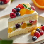 - Assemble the cake: Place one layer on a serving base, soak it with syrup, spread fruit filling on it, place the second layer, spread whipped cream on top, and gently press down.