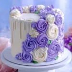 - Use a piping bag to create purple rose swirls around the sides and top of the cake.