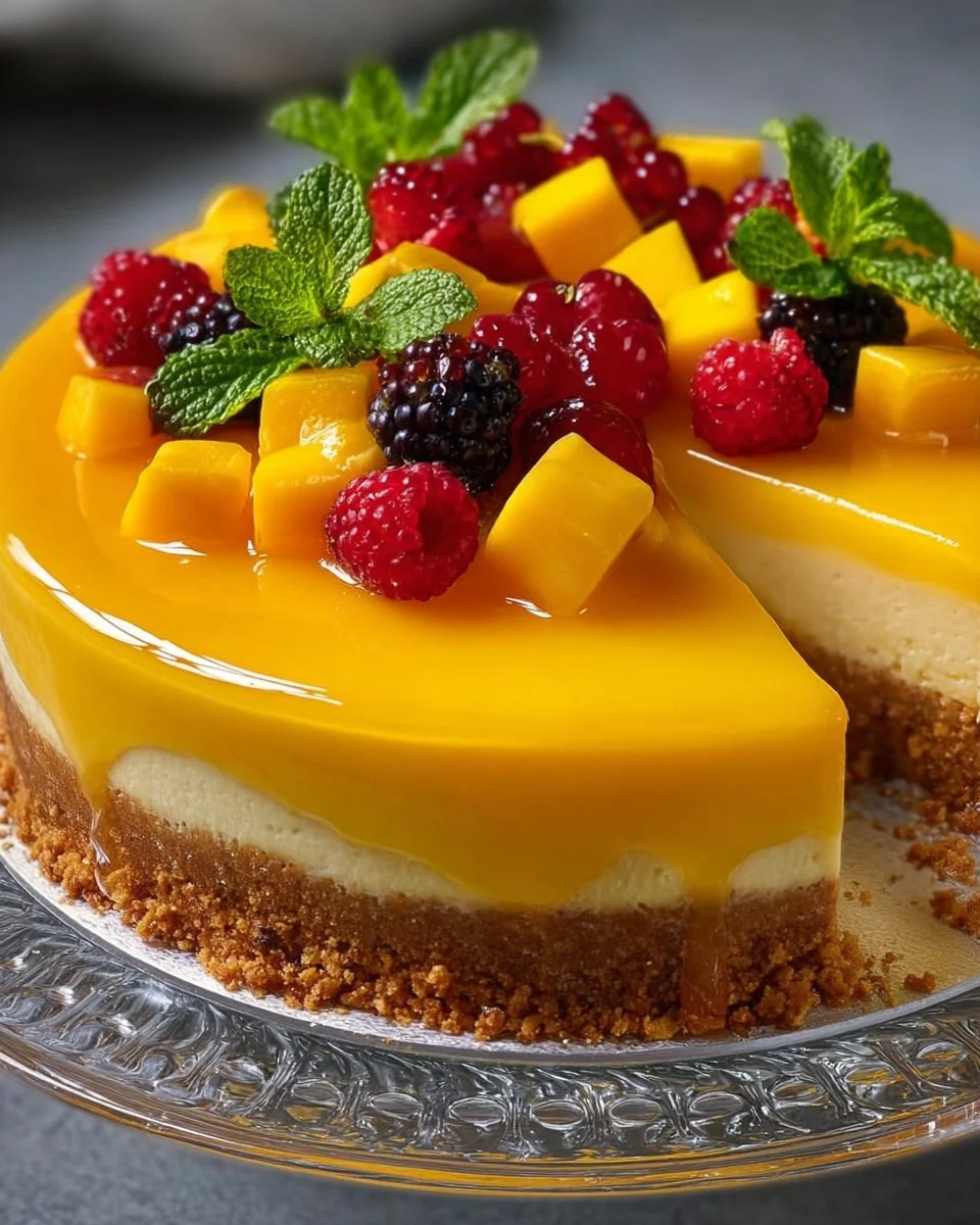 A visually stunning cheesecake combining creamy filling with tropical mango and fresh mixed berries.