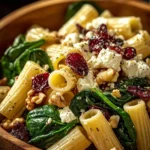 A delicious and refreshing pasta salad featuring feta cheese, sweet cranberries, crunchy walnuts, and fresh spinach, perfect for any occasion.