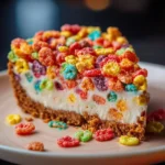 - Garnish & Serve: Sprinkle additional Fruity Pebbles on top before serving. Slice and enjoy!
