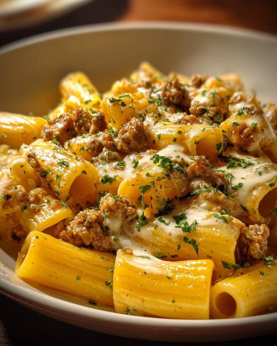 A comforting dish combining tender rigatoni pasta with savory ground beef in a rich, creamy garlic butter cheese sauce.