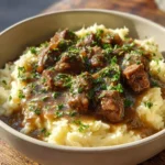 - Plate & Garnish: Spoon the creamy mash into bowls, top with beef tips and sauce, and sprinkle with fresh parsley.
