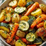 A delicious and easy side dish featuring a colorful mix of baby potatoes, carrots, and zucchini, perfectly roasted with garlic and Italian herbs.