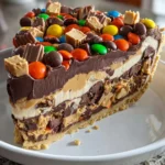 This pie is not just appealing because of its looks; it’s also incredibly tasty! It’s an indulgent no-bake treat that is easy to prepare. With layers of creamy peanut butter filling topped with smooth chocolate ganache, it captures the essence of a Reese’s Peanut Butter Cup in pie form. Plus, topping it with assorted Reese’s candies makes it even more fun and festive.