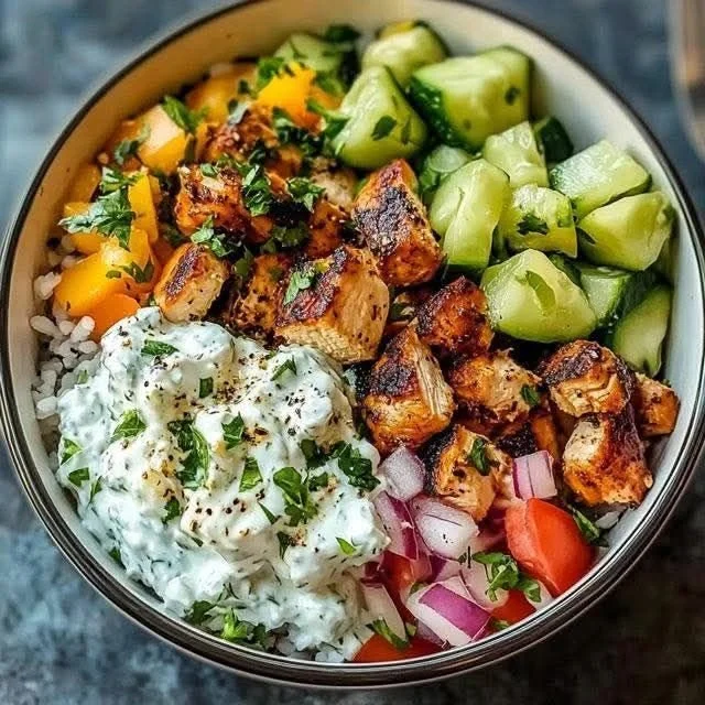 A refreshing and hearty dish featuring marinated chicken, creamy tzatziki sauce, and fresh vegetables, perfect for a light dinner or packed lunch.