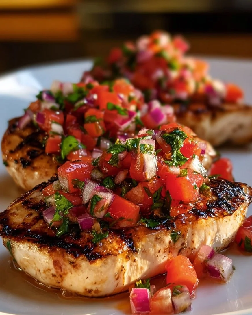 A fresh and tasty dish combining juicy grilled chicken with a vibrant bruschetta topping, perfect for any occasion.
