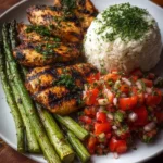 Assemble the dish: On a plate, layer the fluffy rice, grilled chicken, roasted asparagus, and a scoop of fresh tomato salsa. Garnish with extra parsley for a nice touch.