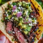 - Assemble the tacos by adding slices of steak, avocado salsa, and a sprinkle of cotija cheese.