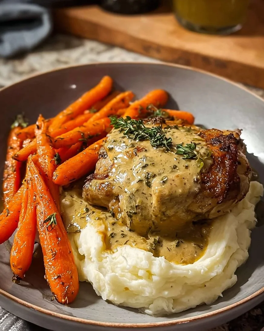 A warm and comforting dish combining juicy chicken thighs, fragrant herb butter, tender roasted carrots, and creamy mashed potatoes. Perfect for family dinners or special gatherings.