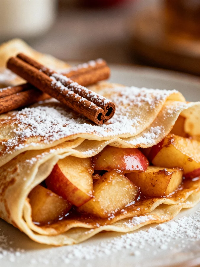 Place a crepe on a plate, spoon some cinnamon apple filling in the center, and fold or roll the crepe. Repeat with remaining crepes and filling.