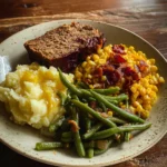 A classic homemade meatloaf recipe paired with creamy mashed potatoes and fresh sautéed vegetables.