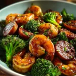 A quick and flavorful stir-fry combining juicy shrimp, smoky sausage, and fresh broccoli in a sweet and savory honey garlic sauce.